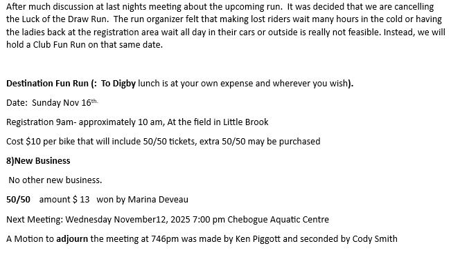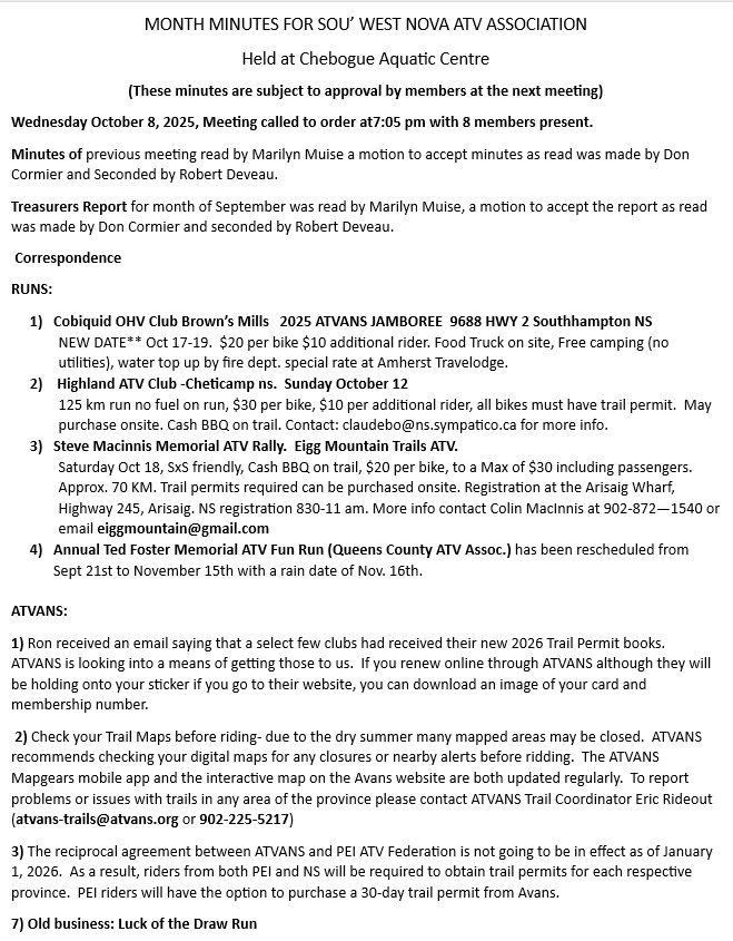 Monthly Meeting's are held the 2nd Wednesday of the Month at the Chebogue Aquatic Centre, Chebogue at 7 pm.